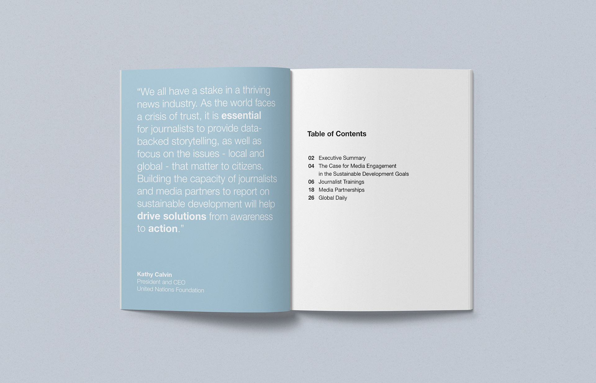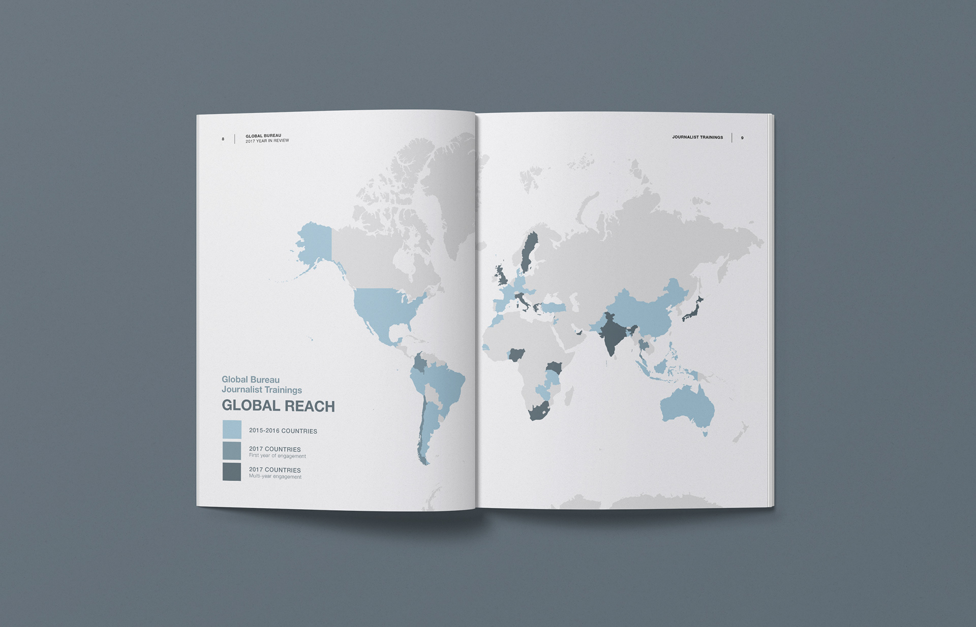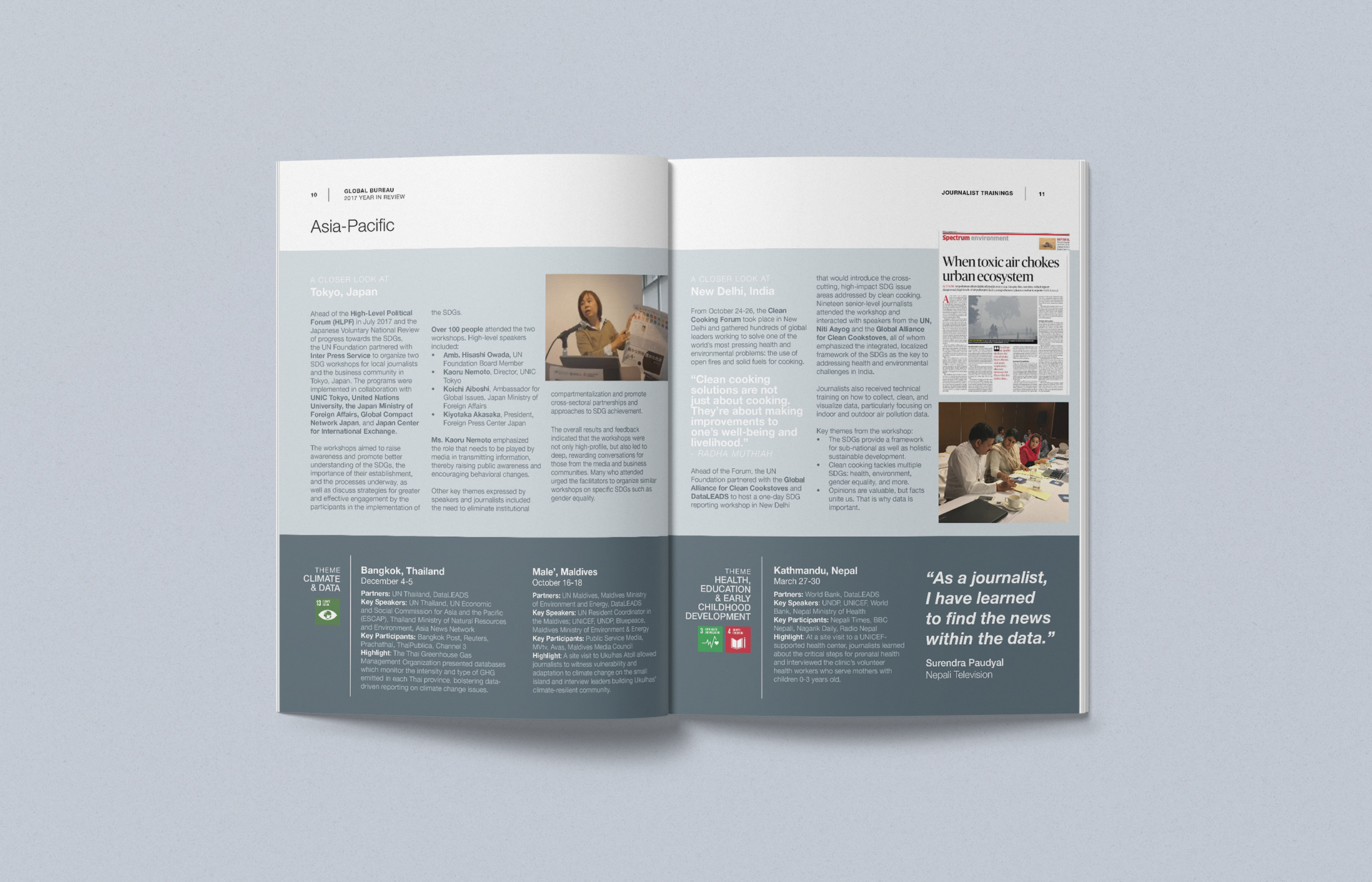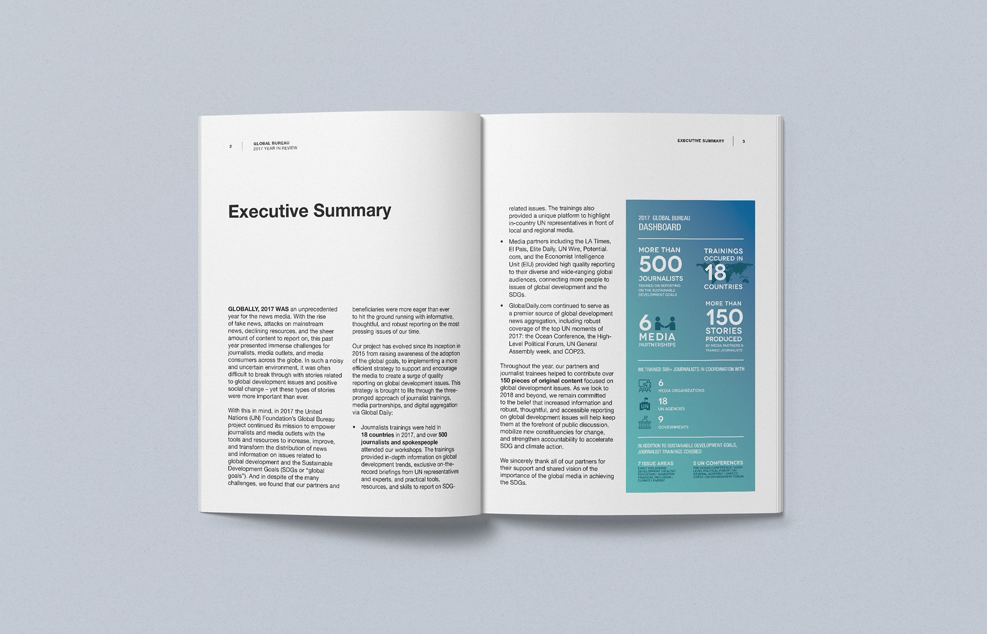 In 2017, the UN Foundation's Global Bureau project helped train over 500 journalists across 18 countries. These reporters went on to produce more than 150 pieces of original content focused on global development issues. As a Communications Associate, I coordinated the program, edited the report, and designed the publication featuring the activities and partners who helped make the project a success.
