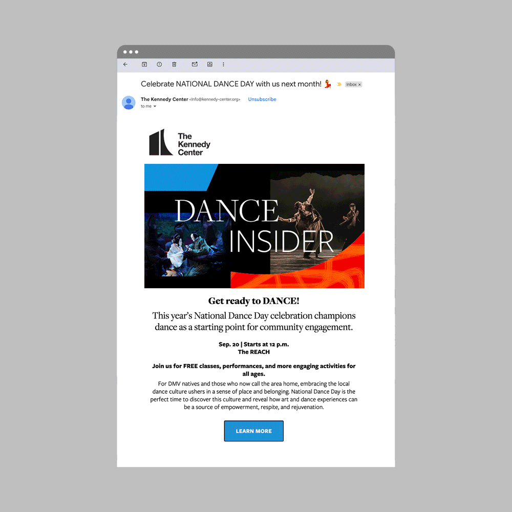 I designed marketing materials promoting two seasons of classical and contemporary Dance at the Kennedy Center. I wanted the artwork presented in the season brochures to feel expressive and responsive to the graceful shapes or dynamic movement of dancing bodies. During rollout (posters, print and digital ads, direct mail, etc), each individual dance company is defined by singular expressive design elements inspired by their identity and the performances they will bring to the stage.