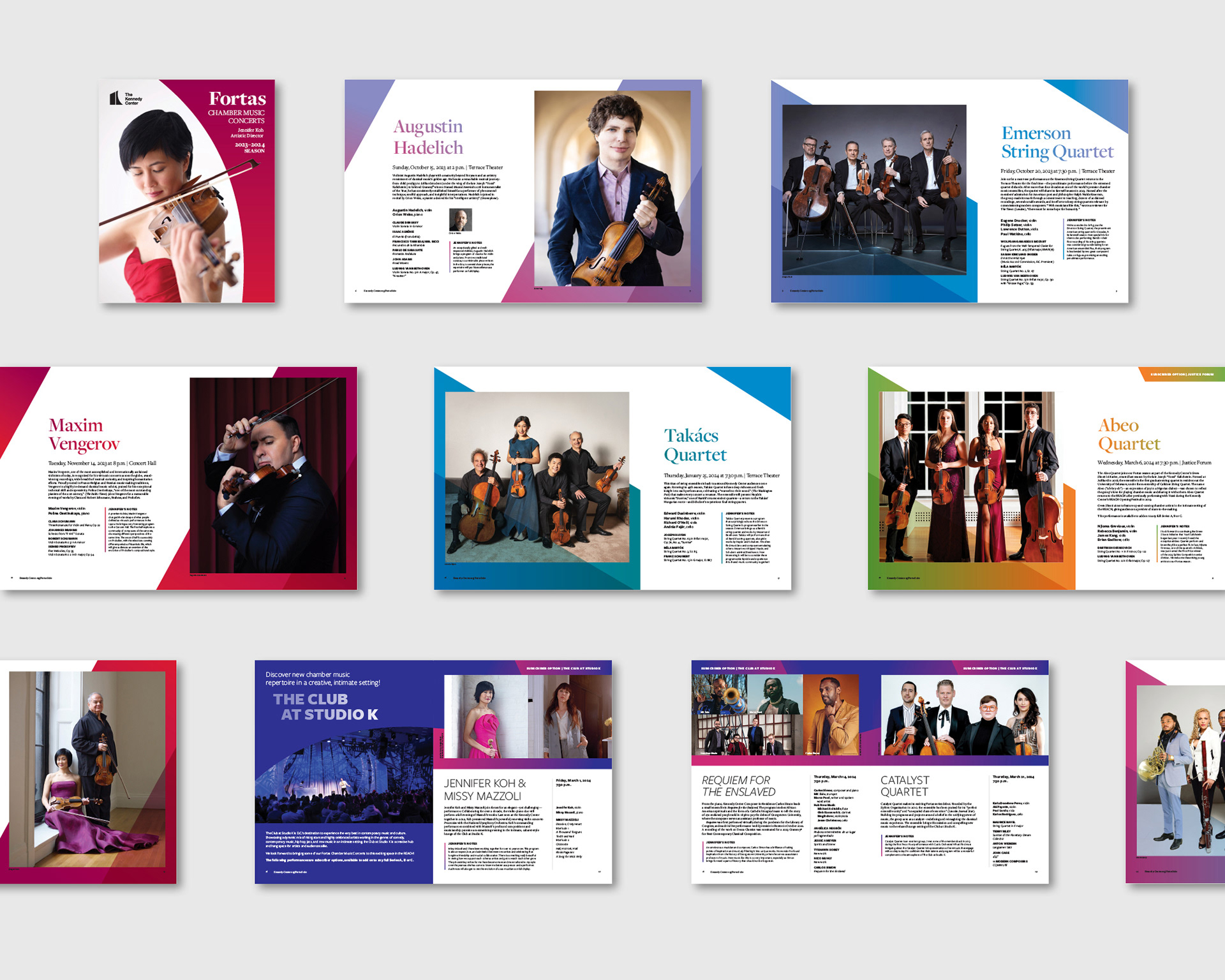 I designed marketing materials promoting the 2023–2024 Fortas Chamber Music Concerts season at The Kennedy Center. To present Jennifer Koh's first season as Artistic Director, I wanted the brochure to reflect her fresh perspective and forward-thinking energy while still evoking the refined elegance of classical music. For Club at Studio K, a showcase for contemporary music and culture, the layouts explore asymmetry and feel more experimental.